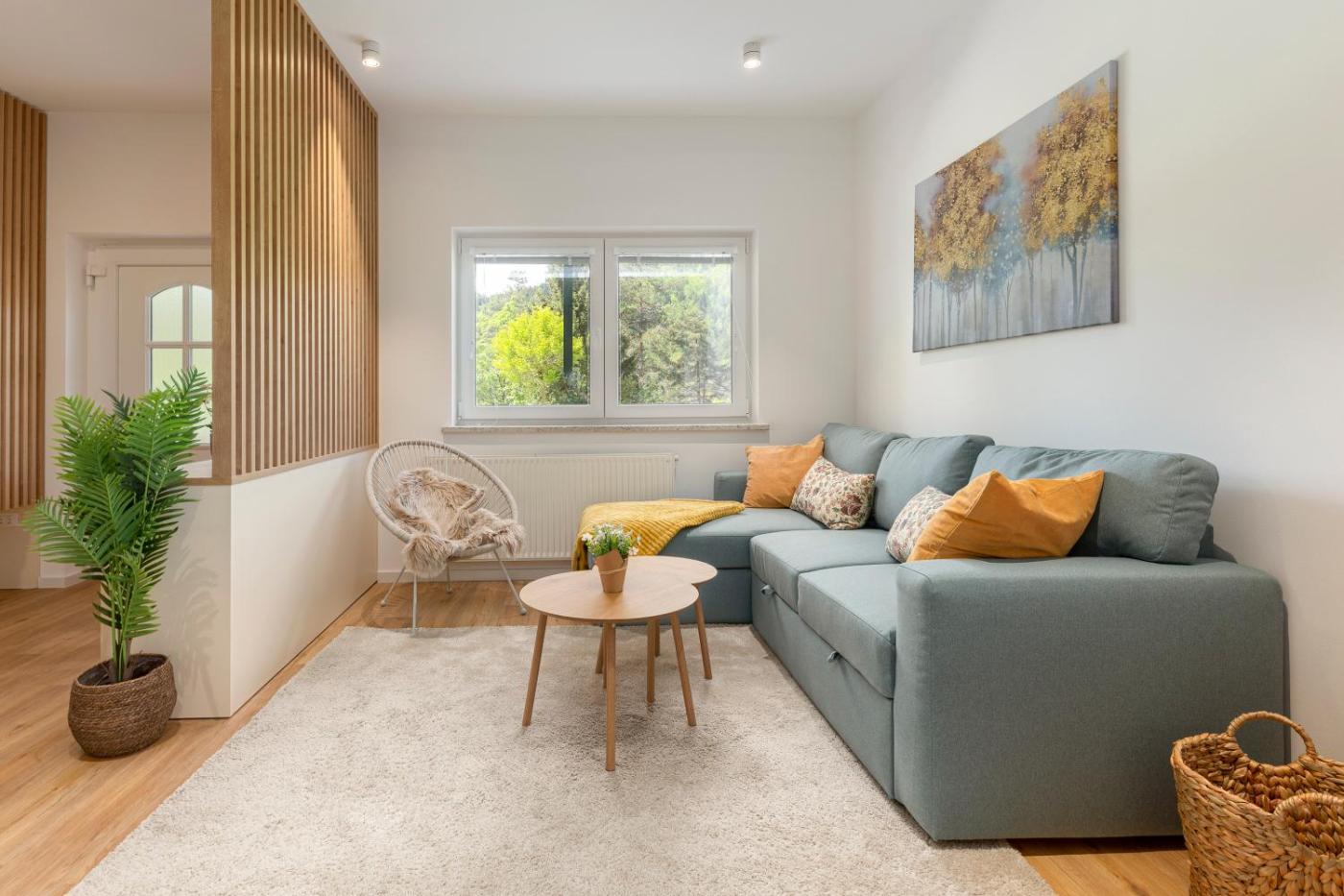 Apartment with Sauna. Guests will have a special experience as this apartment offers a sauna. Featuring a private entrance, this apartment is comprised of 1 living room, 1 separate bedroom and 1 bathroom with a shower and a hairdryer. Guests will find a stovetop, a refrigerator, a dishwasher and kitchenware in the well-equipped kitchen. The apartment also has a barbecue. The apartment features a washing machine, a coffee machine, a seating area as well as a terrace with garden views. The unit offers 2 beds.