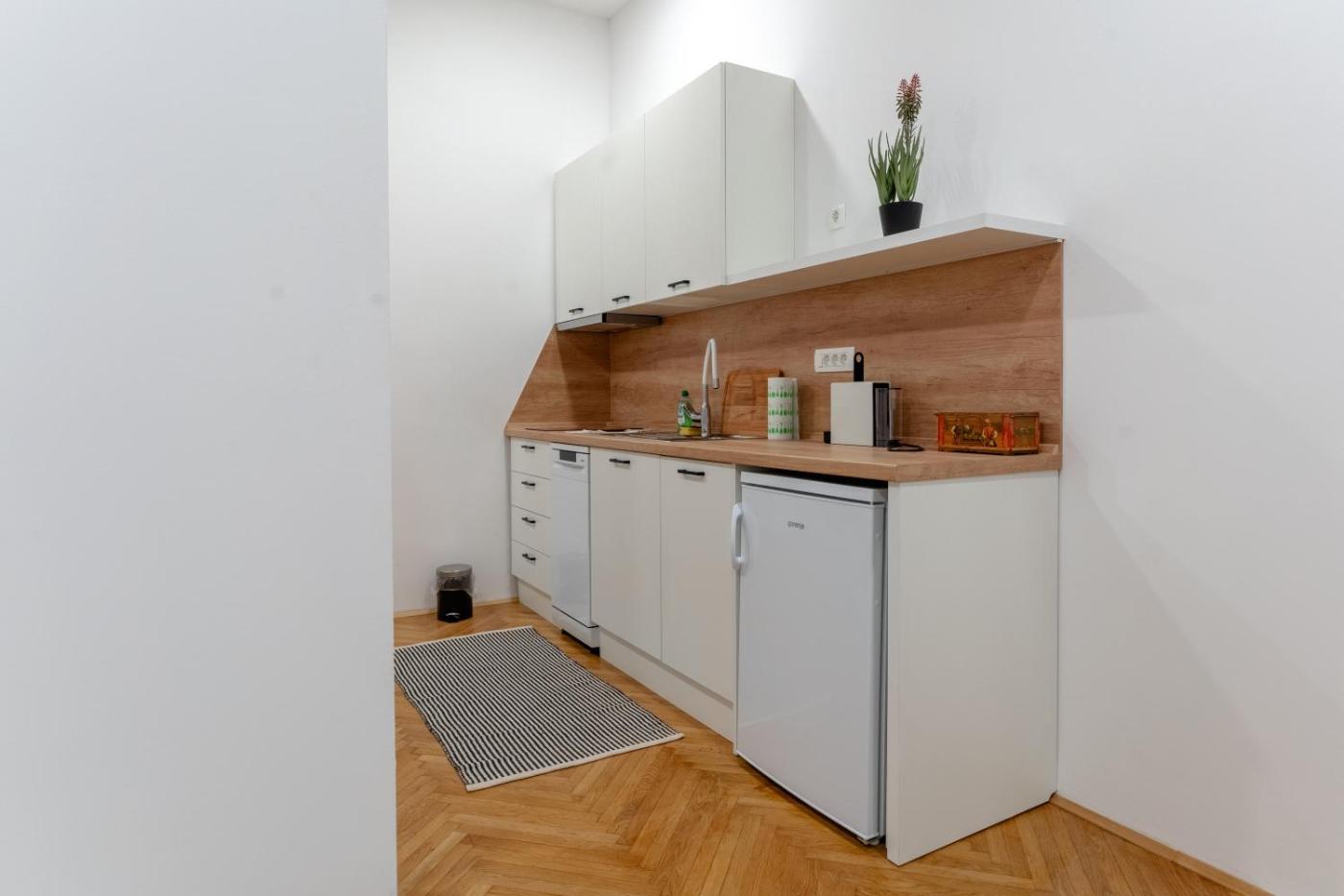 One-Bedroom Apartment. Boasting a private entrance, this air-conditioned apartment comes with 1 living room, 1 separate bedroom and 1 bathroom with a walk-in shower and a hairdryer. Guests can make meals in the kitchen that features a stovetop, a refrigerator, a dishwasher and kitchenware. The apartment has parquet floors, a seating area with a flat-screen TV, a coffee machine, a dining area, as well as a wardrobe. The unit has 2 beds. ;