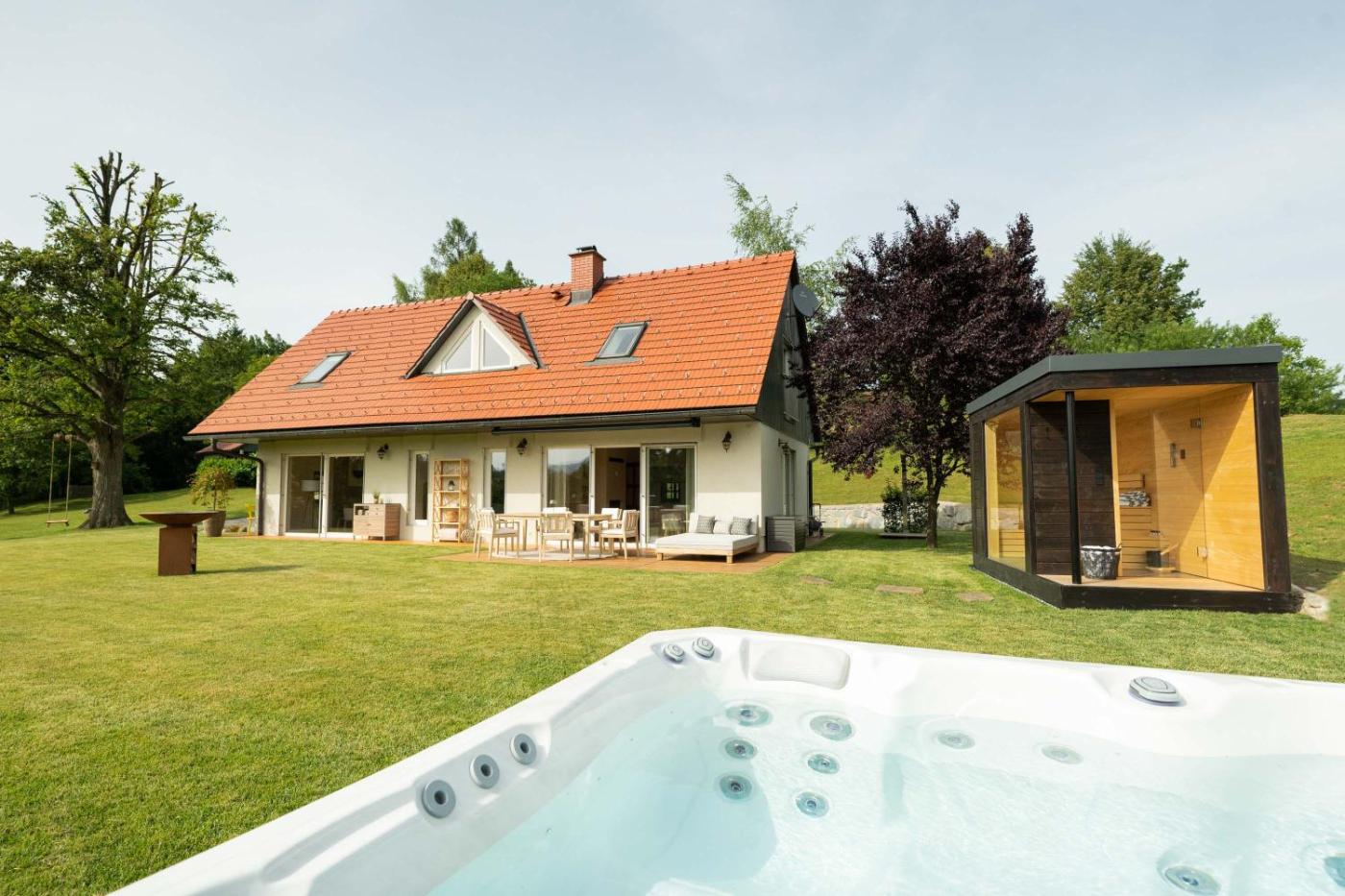 16 km from Maribor Train Station in Zgornja Kungota, An der Südsteirischen Weinstraße Gamlitz - Idyllisches Ferienhäuschen im Naturparadies mit großem Whirlpool & Panoramasauna offers accommodation with access to a hot tub, spa facilities and wellness packages. Private parking is available on site at this recently renovated property. Offering free WiFi throughout the property, the non-smoking holiday home features a sauna.